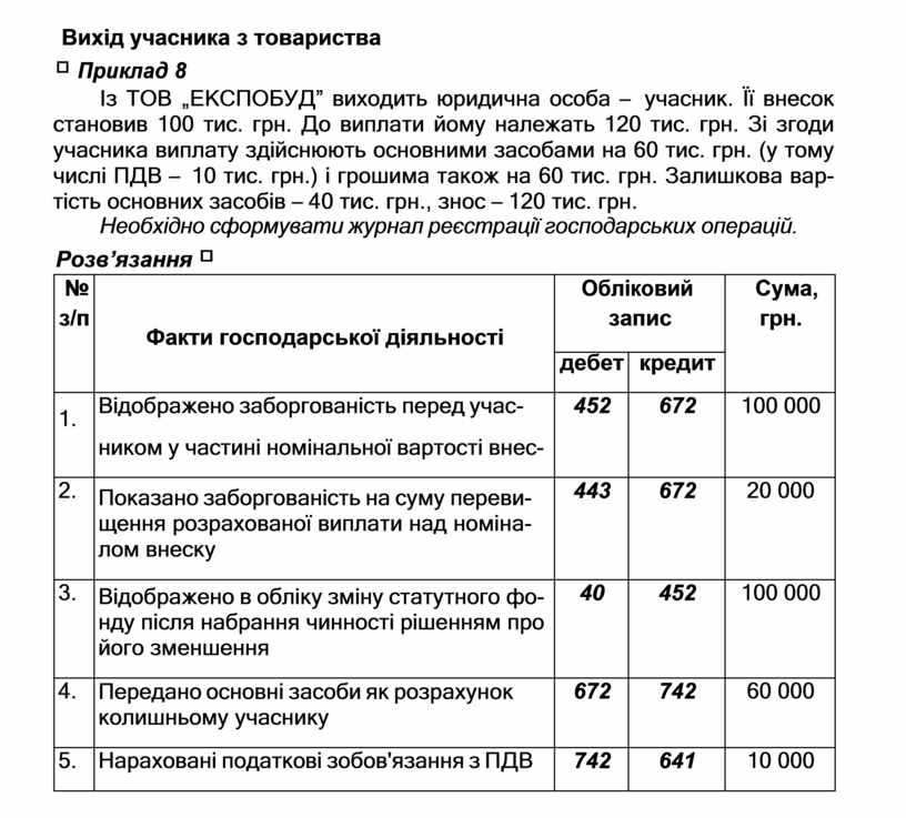 Із ТОВ „ЕКСПОБУД” виходить юридична особа – учасник. Її внесок становив 100 тис. грн. До виплати йому належать 120 тис. грн. Зі згоди учасника виплату здійснюють основними засобами на 60 тис. грн. (у тому числі ПДВ – 10 тис. грн.) і грошима також на 60 тис. грн. Залишкова вар- тість основних засобів – 40 тис. грн., знос – 120 тис. грн.