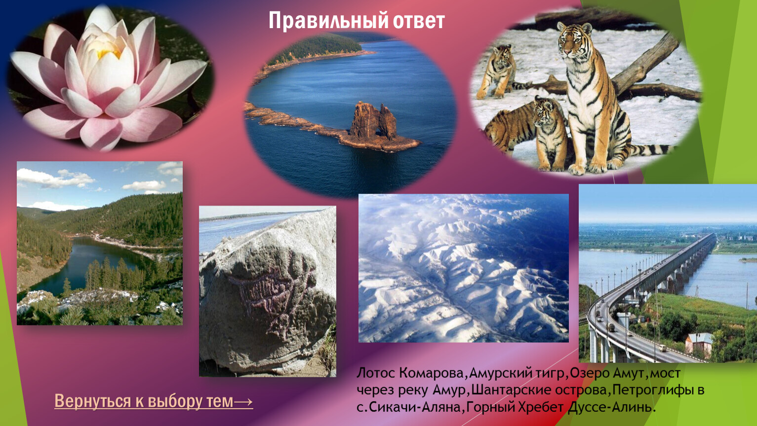 Лотос Комарова,Амурский тигр,Озеро Амут,мост через реку Амур,Шантарские острова,Петроглифы в с.Сикачи-Аляна,Горный Хребет Дуссе-Алинь.