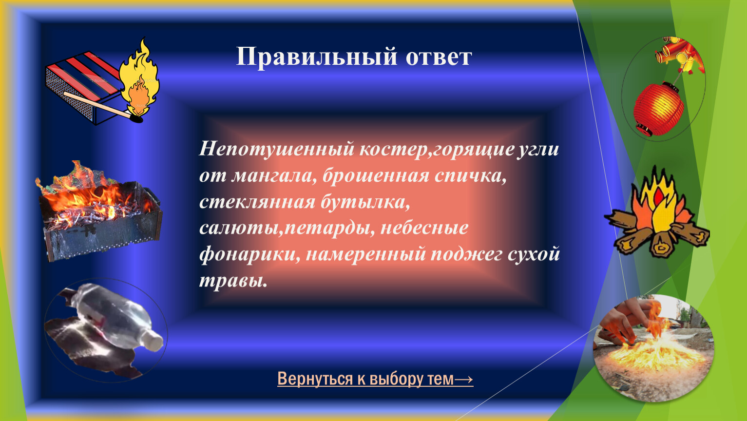 Непотушенный костер,горящие угли от мангала, брошенная спичка, стеклянная бутылка, салюты,петарды, небесные фонарики, намеренный поджег сухой травы.