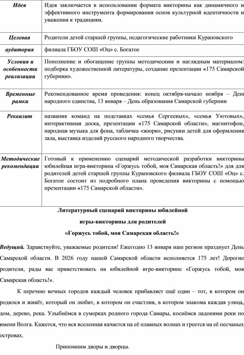 Готовый к применению сценарий методической разработки викторины юбилейная игра-викторина «Горжусь тобой, моя Самарская область!» для для родителей детей старшей группы Кураповского филиала ГБОУ СОШ «Оц» с. Богатое состоит из подробного плана проведения викторины с помощью презентации «175 Самарской области». |