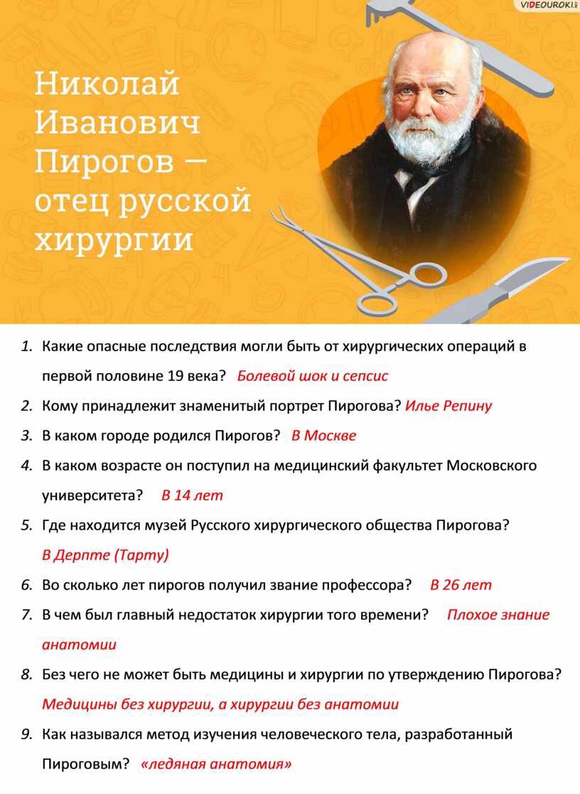 8. Без чего не может быть медицины и хирургии по утверждению Пирогова? Медицины без хирургии, а хирургии без анатомии