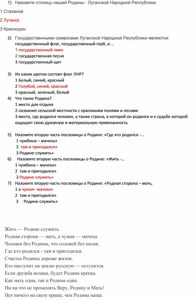 1) Назовите столицу нашей Родины - Луганской Народной Республики.