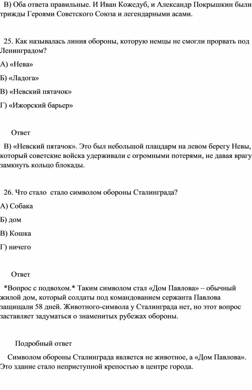 *Вопрос с подвохом.* Таким символом стал «Дом Павлова» – обычный жилой дом, который солдаты под командованием сержанта Павлова защищали 58 дней. Животного-символа у Сталинграда нет, но этот вопрос заставляет задуматься о знаменитых рубежах обороны.