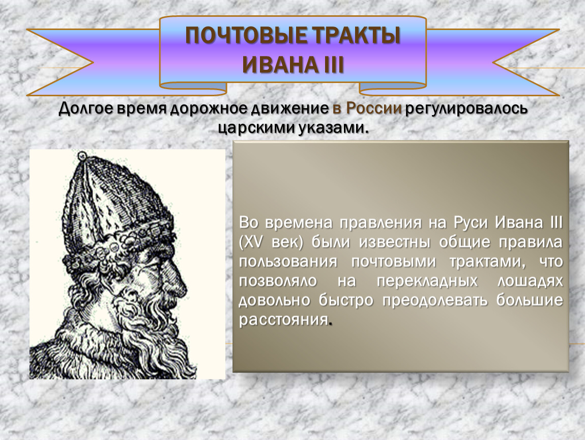 Во времена правления на Руси Ивана III (XV век) были известны общие правила пользования почтовыми трактами, что позволяло на перекладных лошадях довольно быстро преодолевать большие расстояния.