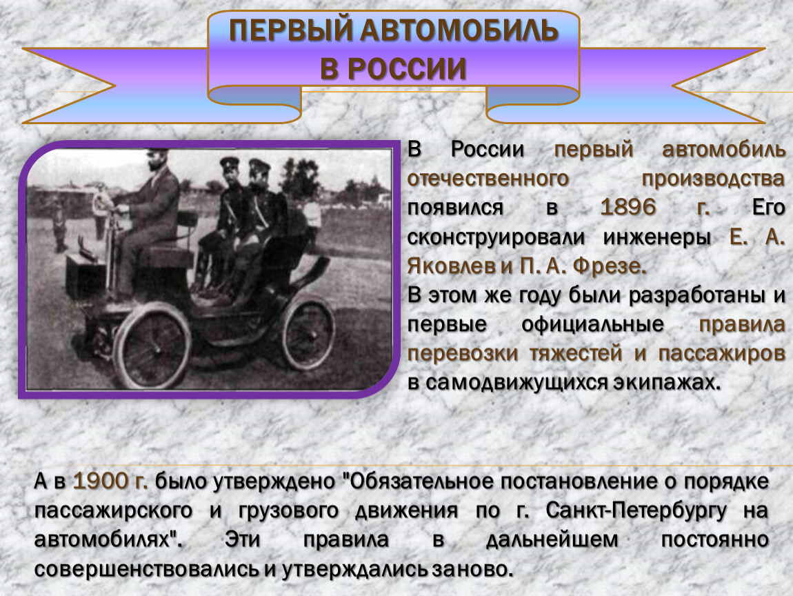 В России первый автомобиль отечественного производства появился в 1896 г. Его сконструировали инженеры Е. А. Яковлев и П. А. Фрезе.