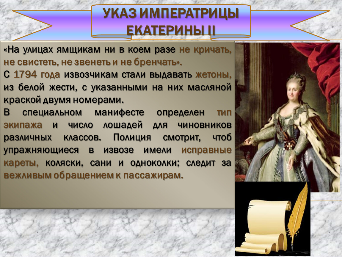 Был издан именной указ, «сказанный разных чинов людям», который категорически запрещал управление лошадьми с помощью вожжей. Тогда считали, что для того, чтобы кучер лучше видел дорогу, он должен управлять лошадью сидя на ней верхом.