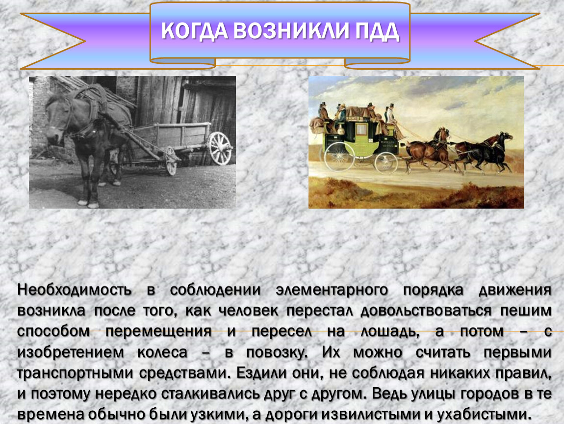 Необходимость в соблюдении элементарного порядка движения возникла после того, как человек перестал довольствоваться пешим способом перемещения и пересел на лошадь, а потом – с изобретением колеса – в повозку. Их можно считать первыми транспортными средствами. Ездили они, не соблюдая никаких правил, и поэтому нередко сталкивались друг с другом. Ведь улицы городов в те времена обычно были узкими, а дороги извилистыми и ухабистыми.