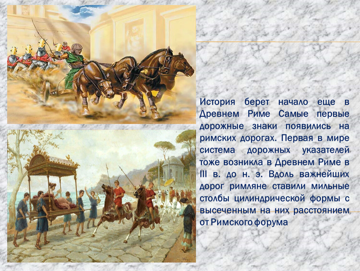 История берет начало еще в Древнем Риме Самые первые дорожные знаки появились на римских дорогах. Первая в мире система дорожных указателей тоже возникла в Древнем Риме в III в. до н. э. Вдоль важнейших дорог римляне ставили мильные столбы цилиндрической формы с высеченным на них расстоянием от Римского форума