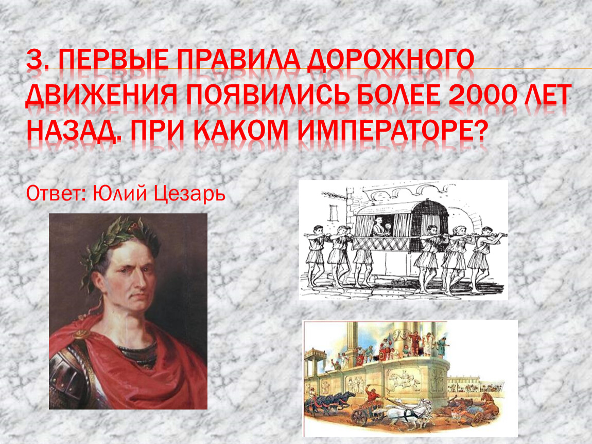 3. Первые правила дорожного движения появились более 2000 лет назад. При каком императоре?