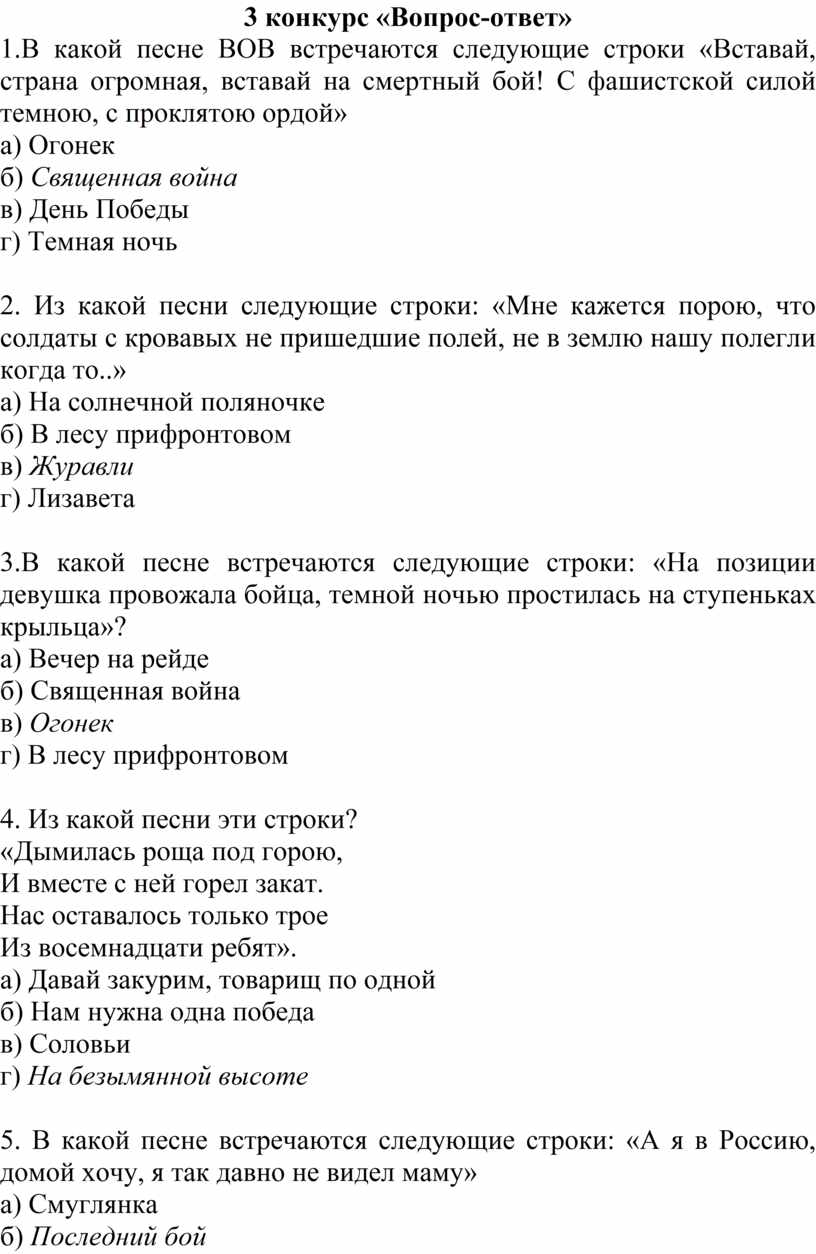 1.В какой песне ВОВ встречаются следующие строки «Вставай, страна огромная, вставай на смертный бой! С фашистской силой темною, с проклятою ордой»