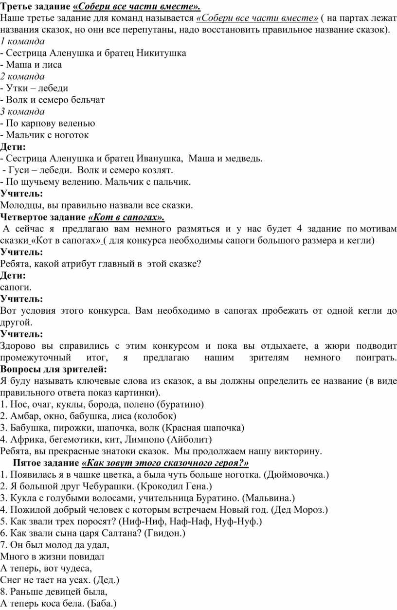 Наше третье задание для команд называется «Собери все части вместе» ( на партах лежат названия сказок, но они все перепутаны, надо восстановить правильное название сказок).