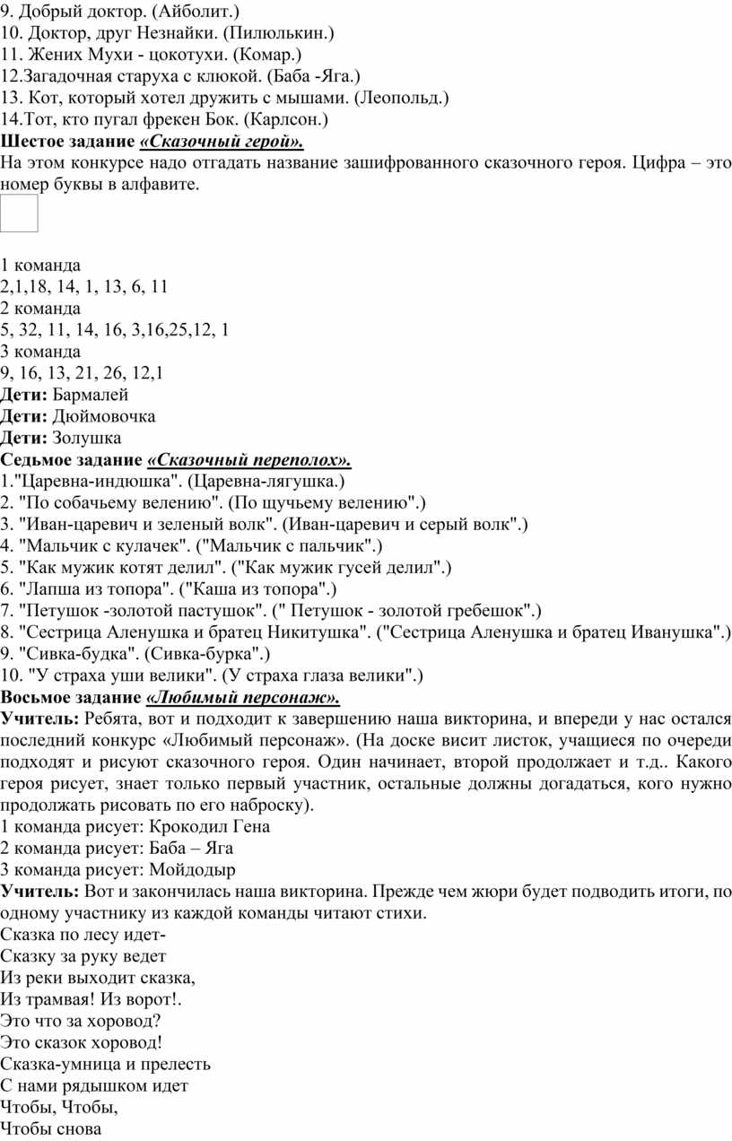 Учитель: Ребята, вот и подходит к завершению наша викторина, и впереди у нас остался последний конкурс «Любимый персонаж». (На доске висит листок, учащиеся по очереди подходят и рисуют сказочного героя. Один начинает, второй продолжает и т.д.. Какого героя рисует, знает только первый участник, остальные должны догадаться, кого нужно продолжать рисовать по его наброску).