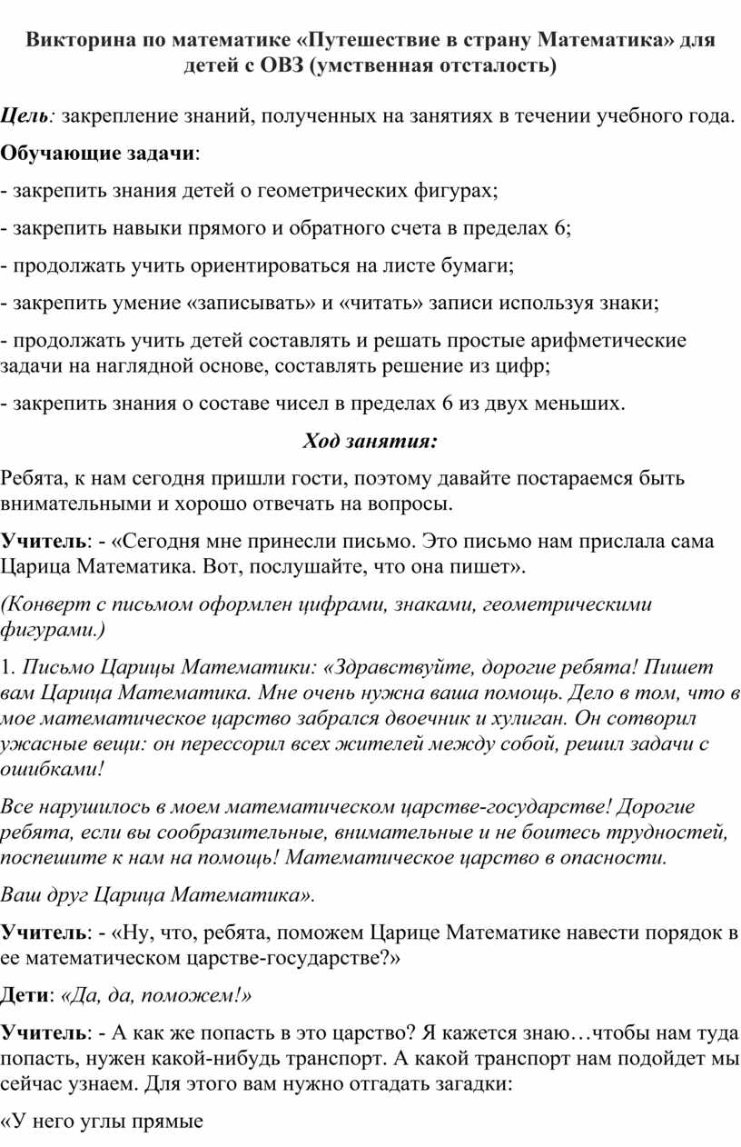 Викторина по математике «Путешествие в страну Математика» для детей с ОВЗ (умственная отсталость)