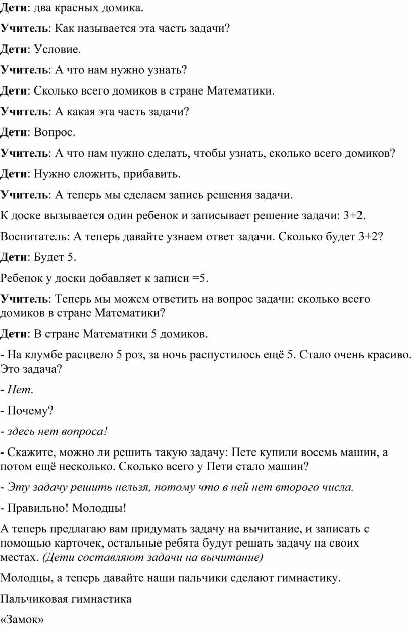 Итак, послушайте внимательно задачу. «В стране Математики 3 желтых домика и 2 красных домика. Сколько всего домиков в стране?»