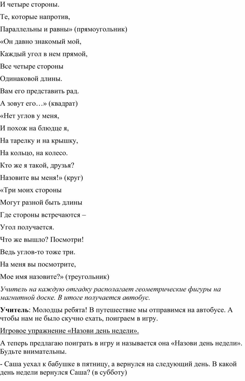 Учитель: Вот мы с вами и побывали в стране Математики. Помогли жителям найти своих соседей, разрешили их спор, поселили в домики, посчитали домики. А теперь нам пора отправляться обратно в детский сад. Сюда мы приехали на автобусе, а обратно поедем на другом транспорте. Сейчас вы узнаете, на чем мы отправимся в путь.