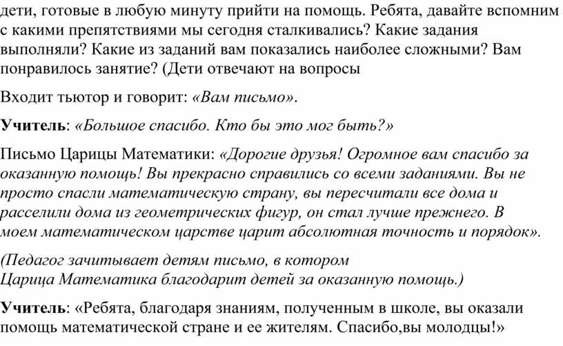 Письмо Царицы Математики: «Дорогие друзья! Огромное вам спасибо за оказанную помощь! Вы прекрасно справились со всеми заданиями. Вы не просто спасли математическую страну, вы пересчитали все дома и расселили дома из геометрических фигур, он стал лучше прежнего. В моем математическом царстве царит абсолютная точность и порядок».