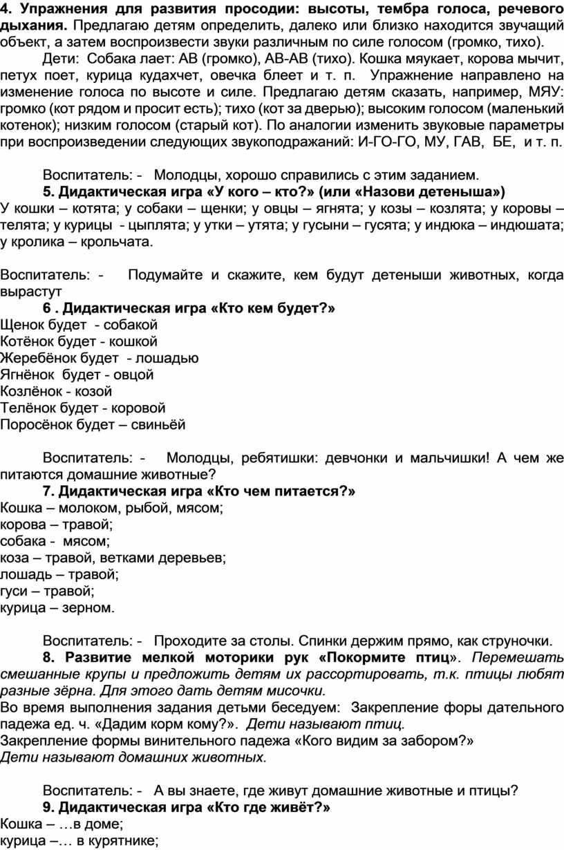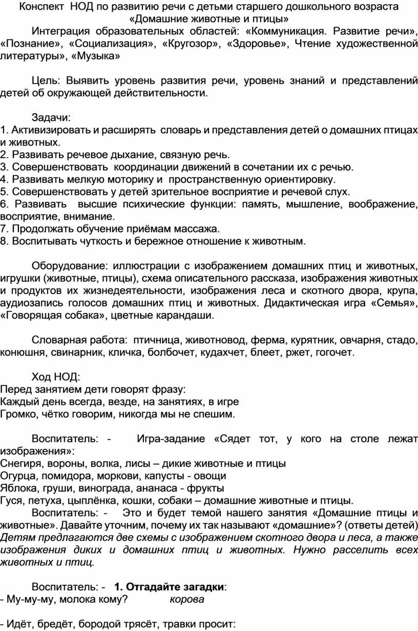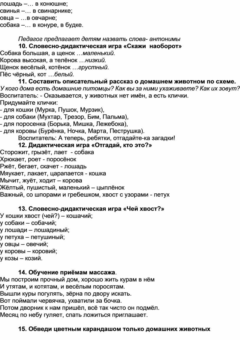 Оборудование: иллюстрации с изображением домашних птиц и животных, игрушки (животные, птицы), схема описательного рассказа, изображения животных и продуктов их жизнедеятельности, изображения леса и скотного двора, крупа, аудиозапись голосов домашних птиц и животных. Дидактическая игра «Семья», «Говорящая собака», цветные карандаши.