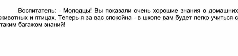 Воспитатель: - Молодцы! Вы показали очень хорошие знания о домашних животных и птицах. Теперь я за вас спокойна - в школе вам будет легко учиться с таким багажом знаний!