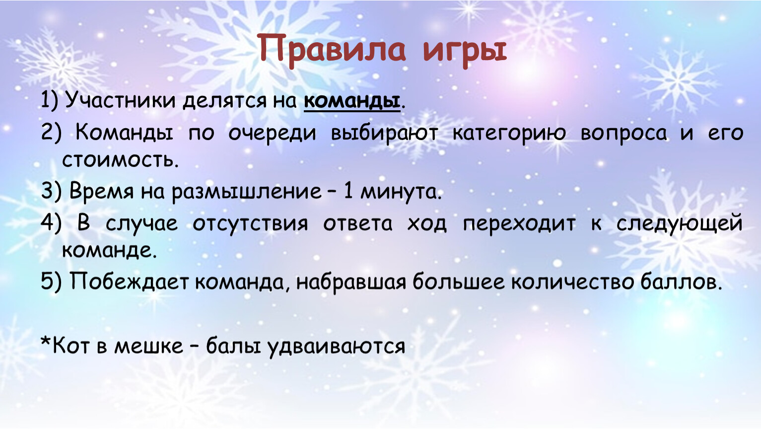 2) Команды по очереди выбирают категорию вопроса и его стоимость.