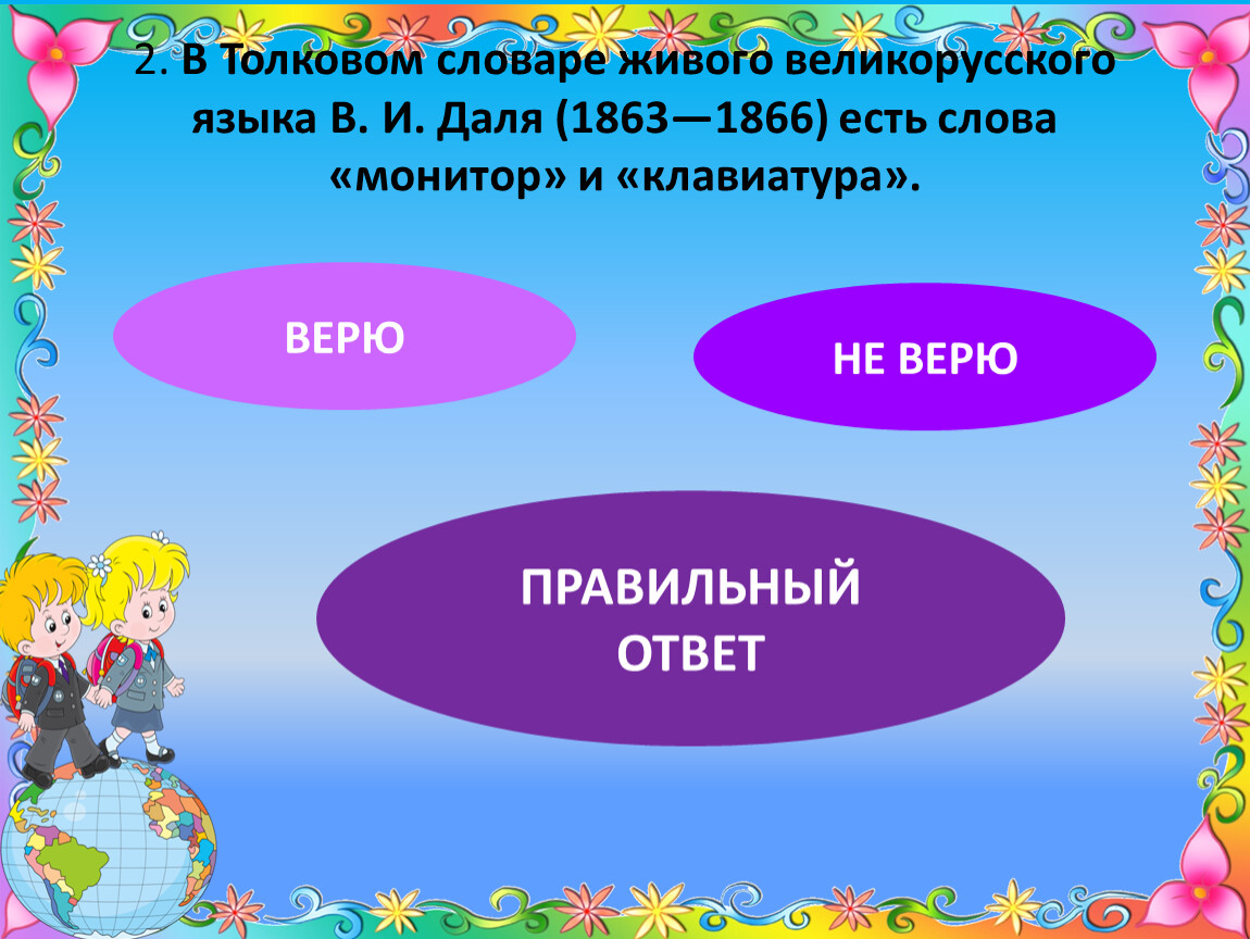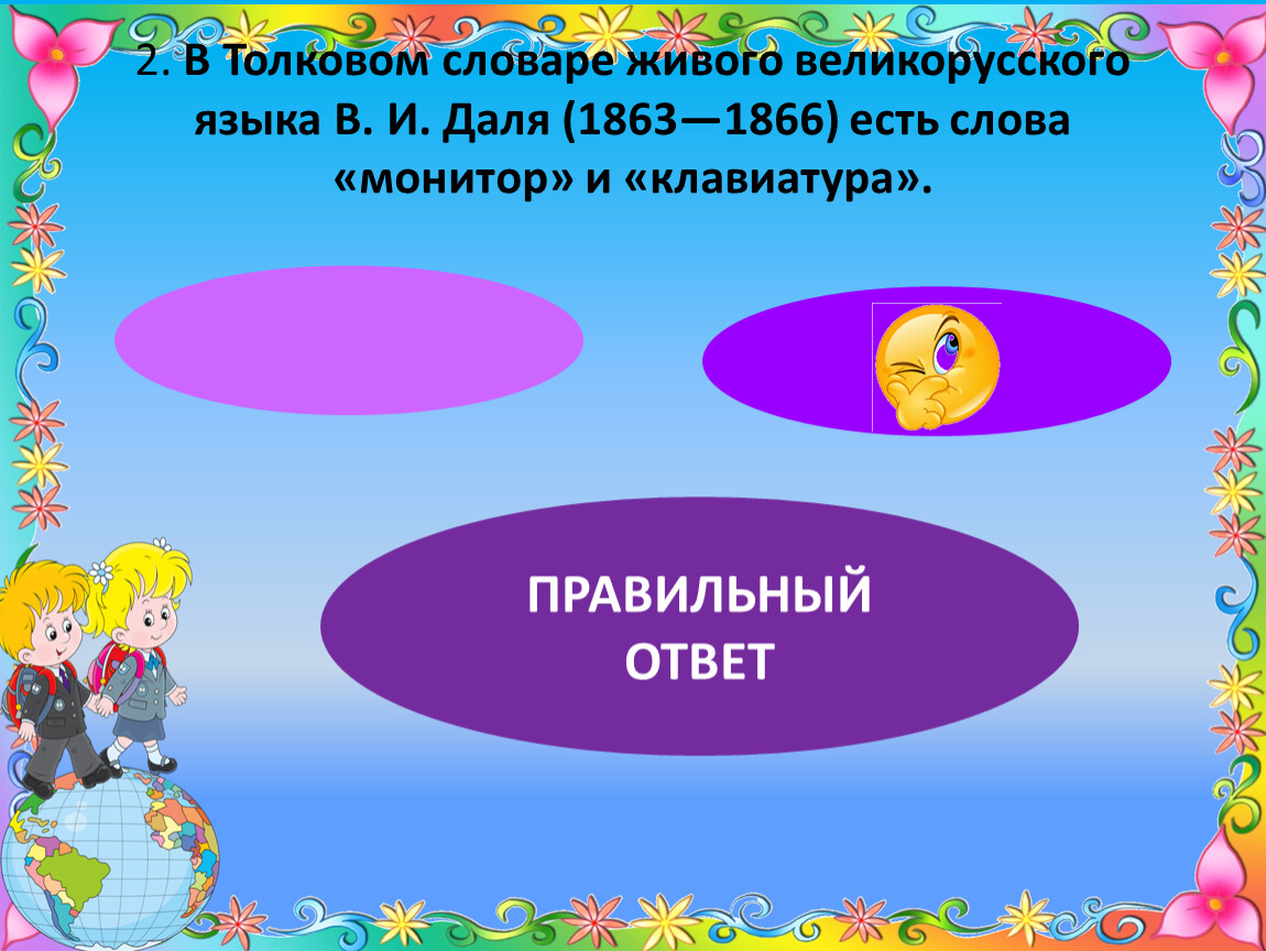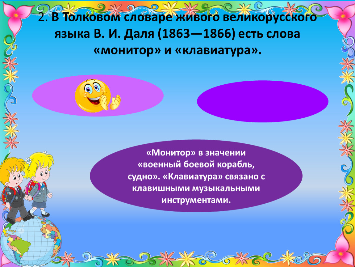 2. В Толковом словаре живого великорусского языка В. И. Даля (1863—1866) есть слова «монитор» и «клавиатура».