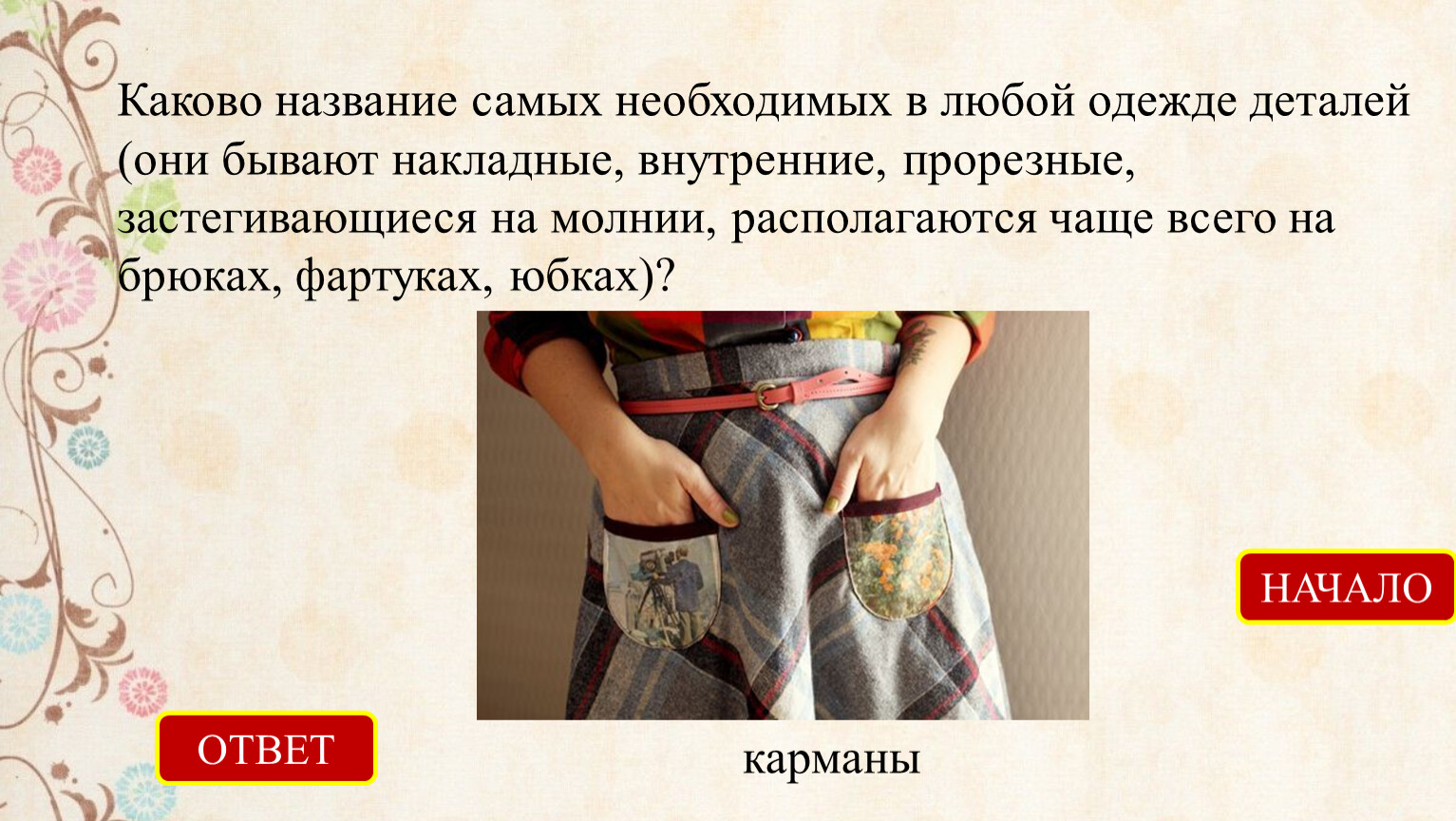 Каково название самых необходимых в любой одежде деталей (они бывают накладные, внутренние, прорезные, застегивающиеся на молнии, располагаются чаще всего на брюках, фартуках, юбках)?