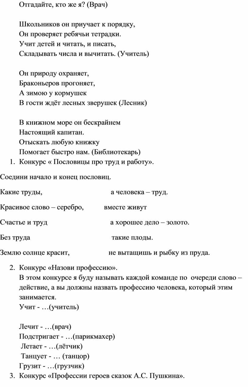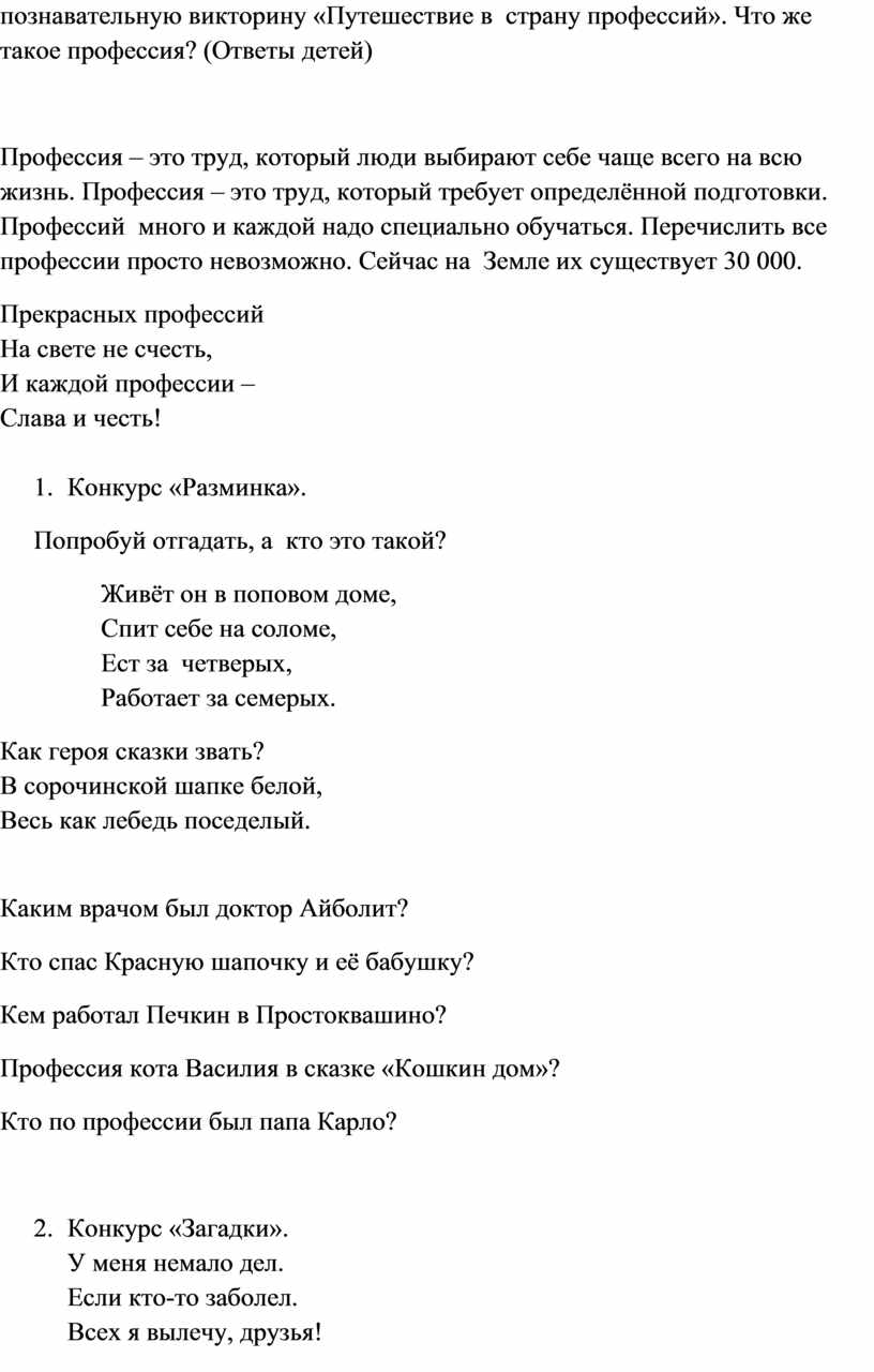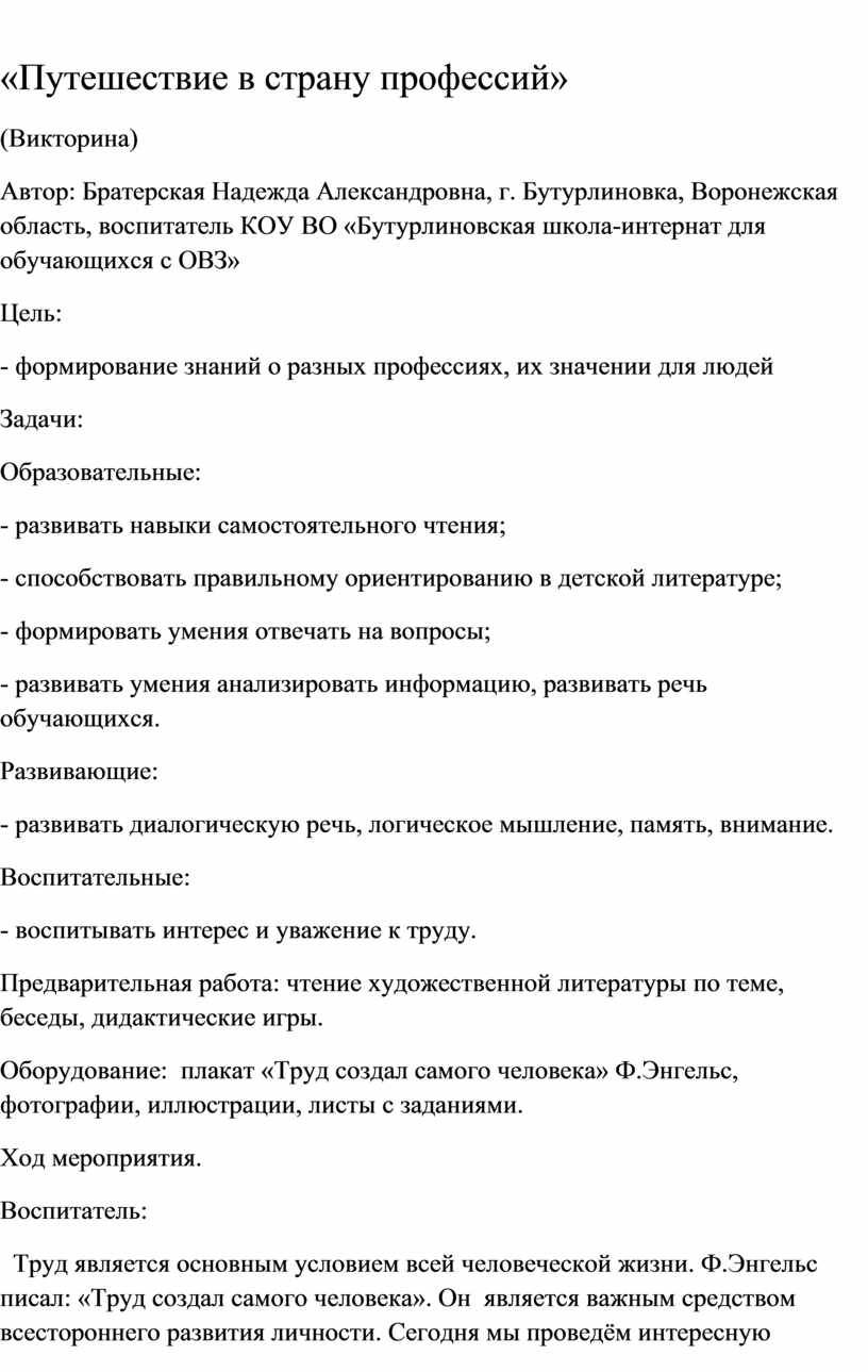 Труд является основным условием всей человеческой жизни. Ф.Энгельс писал: «Труд создал самого человека». Он является важным средством всестороннего развития личности. Сегодня мы проведём интересную познавательную викторину «Путешествие в страну профессий». Что же такое профессия? (Ответы детей)