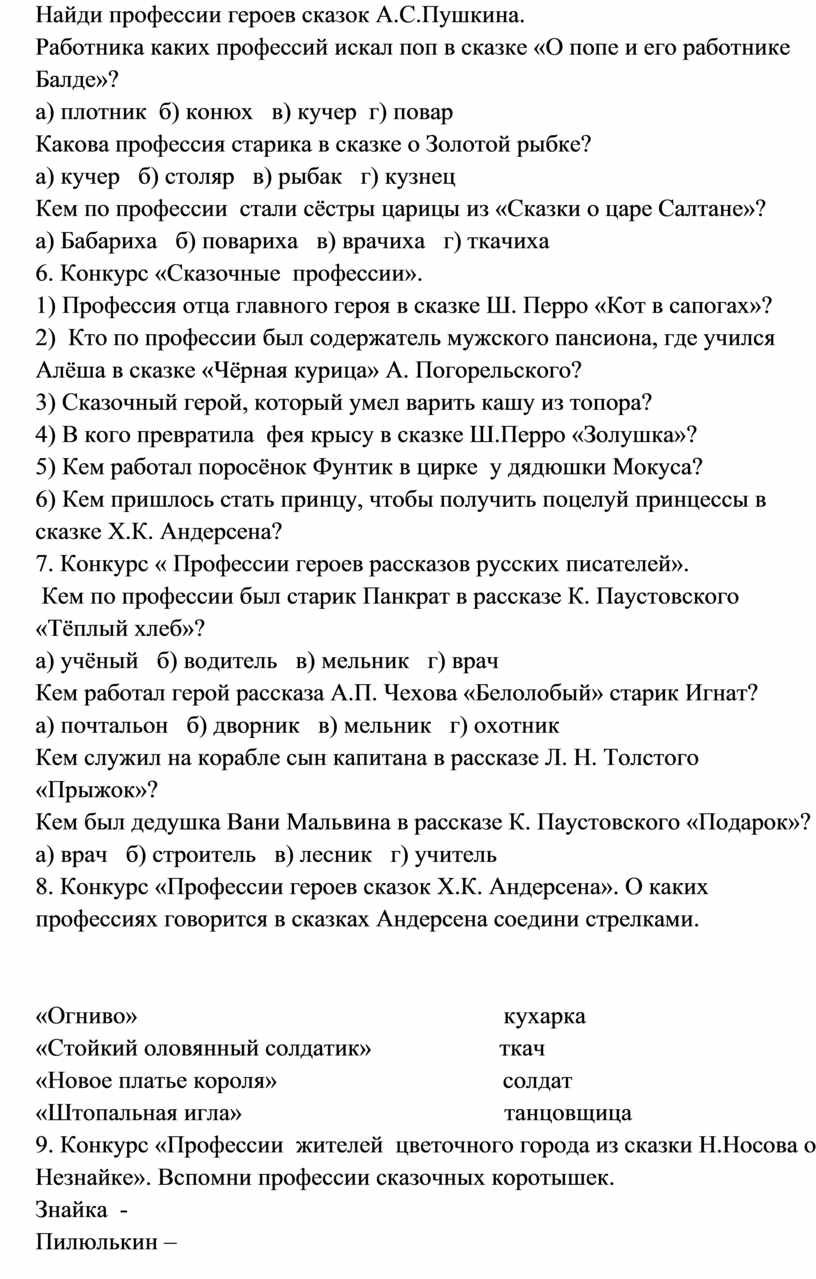 9. Конкурс «Профессии жителей цветочного города из сказки Н.Носова о Незнайке». Вспомни профессии сказочных коротышек.