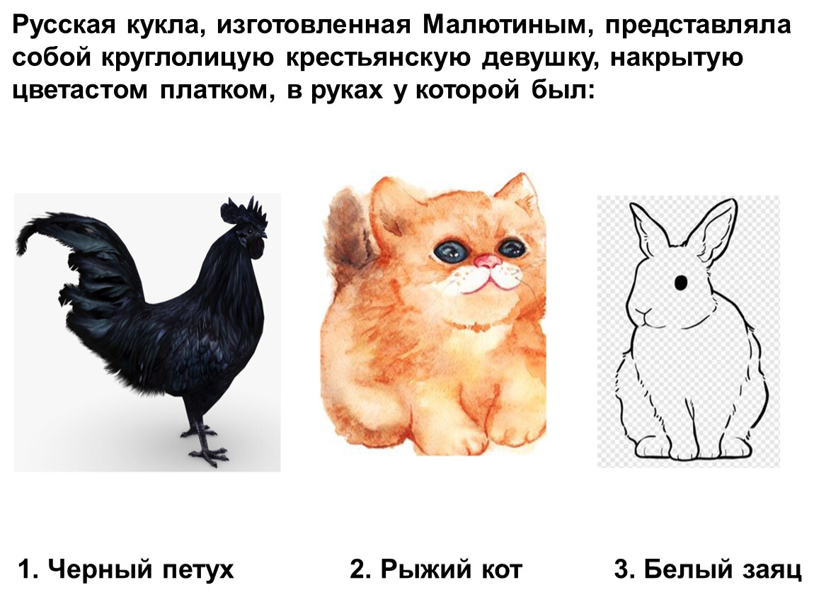 1. Черный петух 2. Рыжий кот 3. Белый заяц