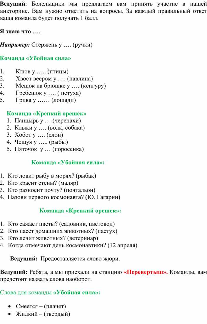 Ведущий: Болельщики мы предлагаем вам принять участие в нашей викторине. Вам нужно ответить на вопросы. За каждый правильный ответ ваша команда будет получать 1 балл.
