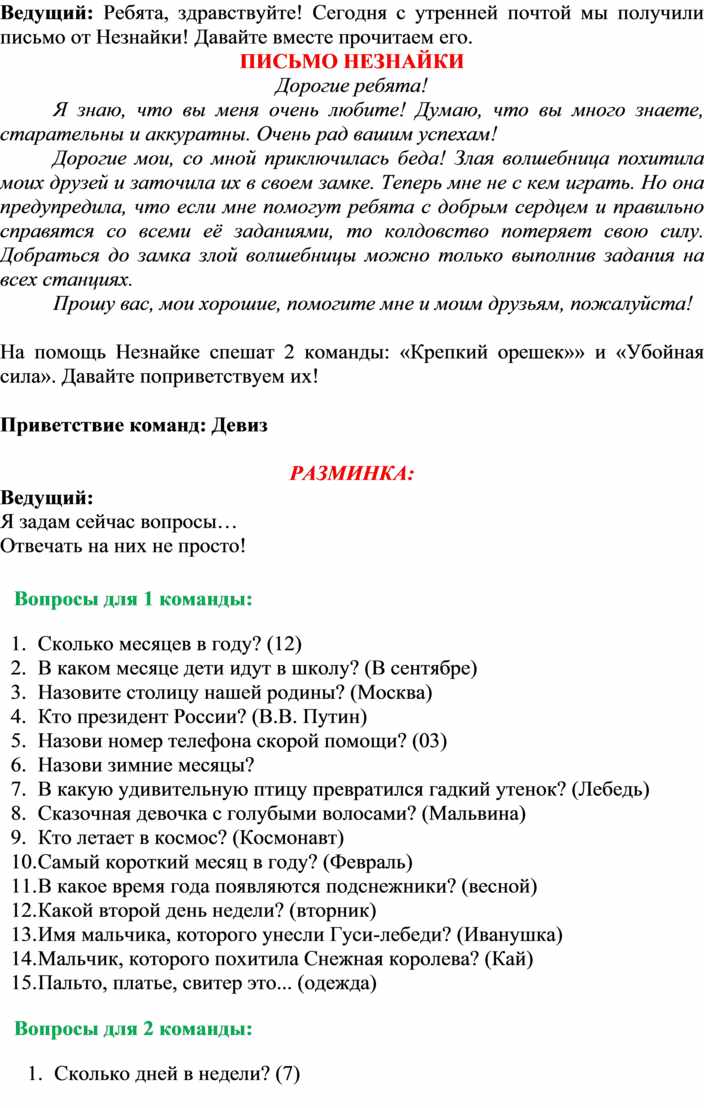 На помощь Незнайке спешат 2 команды: «Крепкий орешек»» и «Убойная сила». Давайте поприветствуем их!