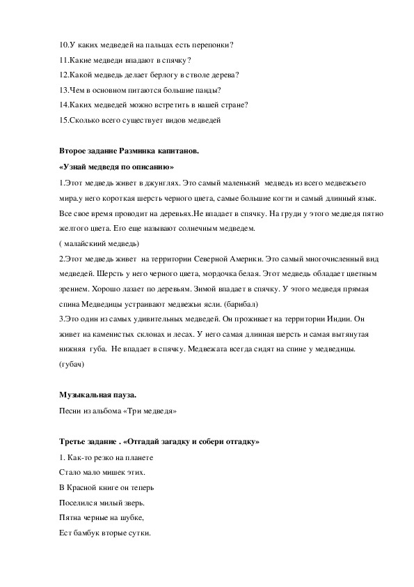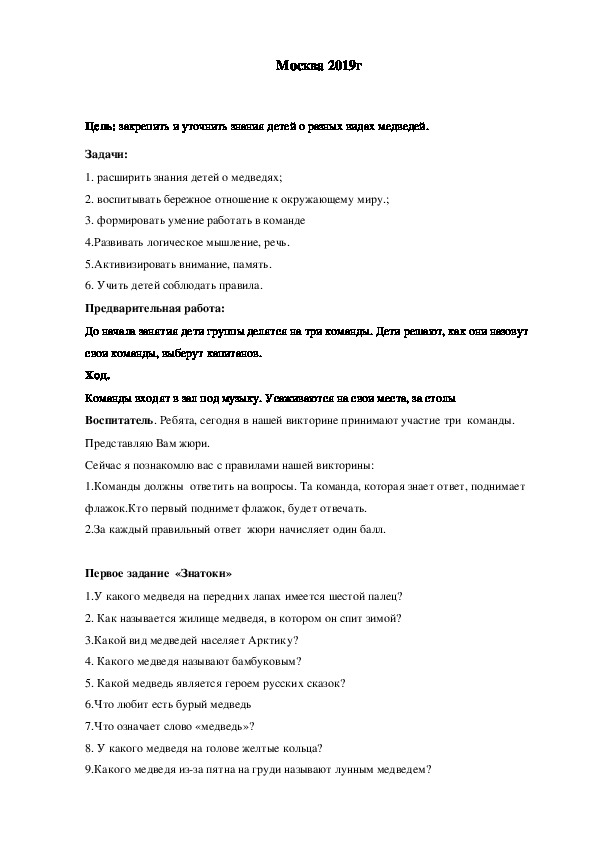 Расширить знания детей о медведях; воспитывать бережное отношение к окружающему миру.; формировать умение работать в команде;