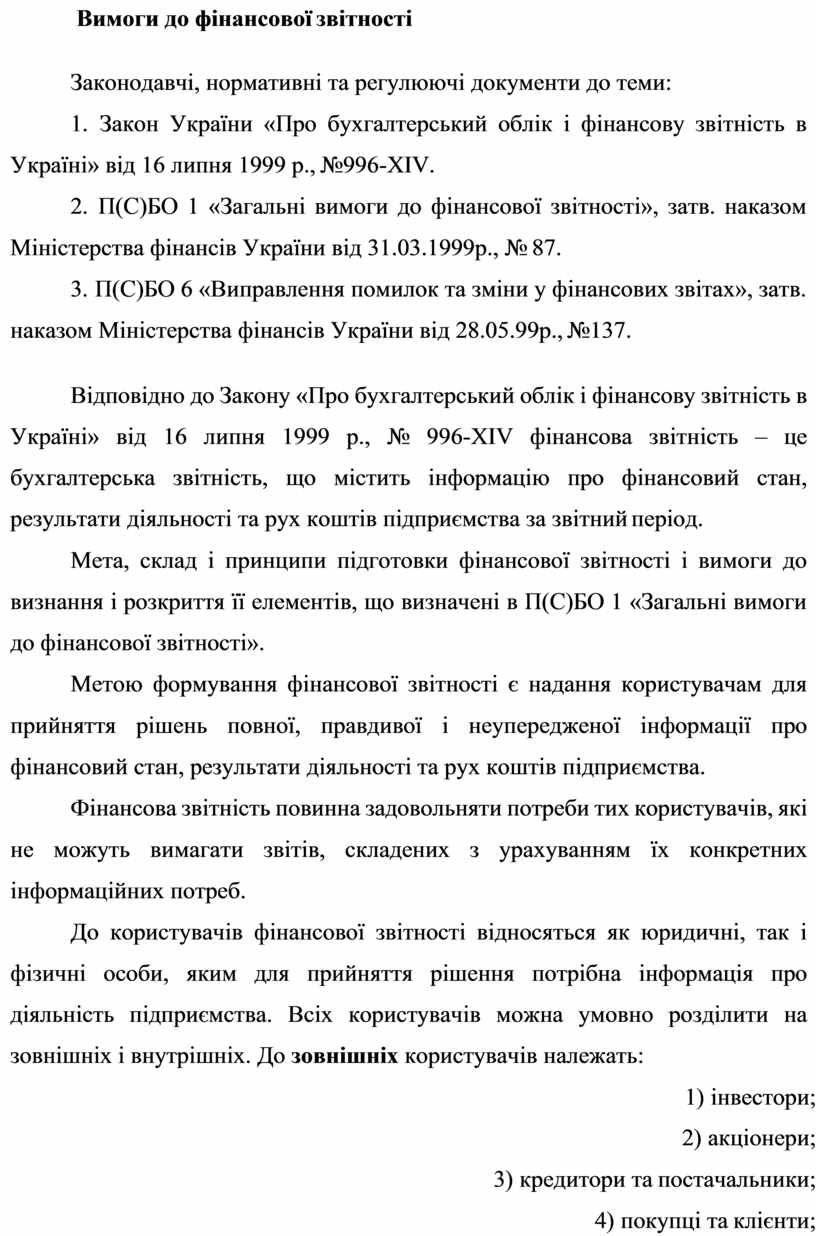 Мета, склад і принципи підготовки фінансової звітності і вимоги до визнання і розкриття її елементів, що визначені в П(С)БО 1 «Загальні вимоги до фінансової звітності».