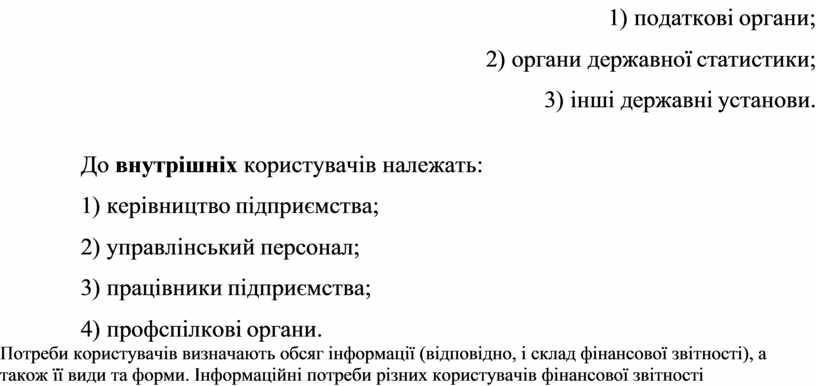 Потреби користувачів визначають обсяг інформації (відповідно, і склад фінансової звітності), а також її види та форми. Інформаційні потреби різних користувачів фінансової звітності