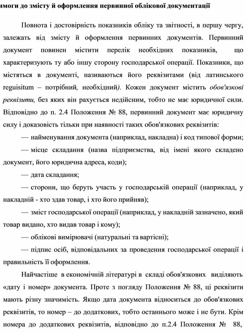 Повнота і достовірність показників обліку та звітності, в першу чергу, залежать від змісту й оформлення первинних документів. Первинний документ повинен містити перелік необхідних показників, що характеризують ту або іншу сторону господарської операції. Показники, що містяться в документі, називаються його реквізитами (від латинського reguisitum – потрібний, необхідний). Кожен документ містить обов'язкові реквізити, без яких він рахується недійсним, тобто не має юридичної сили. Відповідно до п. 2.4 Положення № 88, первинний документ має юридичну силу і доказовість тільки при наявності таких обов'язкових реквізитів: