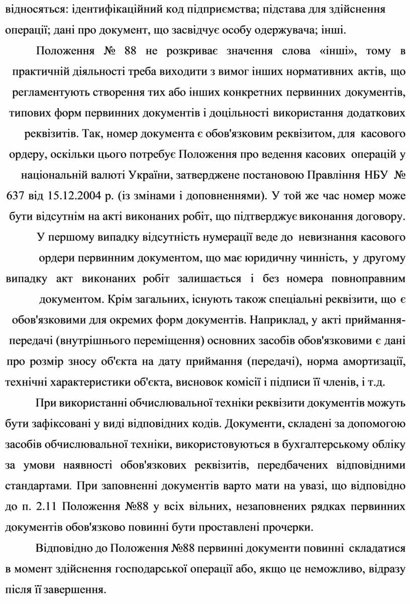 Положення № 88 не розкриває значення слова «інші», тому в практичній діяльності треба виходити з вимог інших нормативних актів, що регламентують створення тих або інших конкретних первинних документів, типових форм первинних документів і доцільності використання додаткових реквізитів. Так, номер документа є обов'язковим реквізитом, для касового ордеру, оскільки цього потребує Положення про ведення касових операцій у національній валюті України, затверджене постановою Правління НБУ № 637 від 15.12.2004 р. (із змінами і доповненнями). У той же час номер може бути відсутнім на акті виконаних робіт, що підтверджує виконання договору. У першому випадку відсутність нумерації веде до невизнання касового ордери первинним документом, що має юридичну чинність, у другому випадку акт виконаних робіт залишається і без номера повноправним документом. Крім загальних, існують також спеціальні реквізити, що є обов'язковими для окремих форм документів. Наприклад, у акті приймання- передачі (внутрішнього переміщення) основних засобів обов'язковими є дані про розмір зносу об'єкта на дату приймання (передачі), норма амортизації,