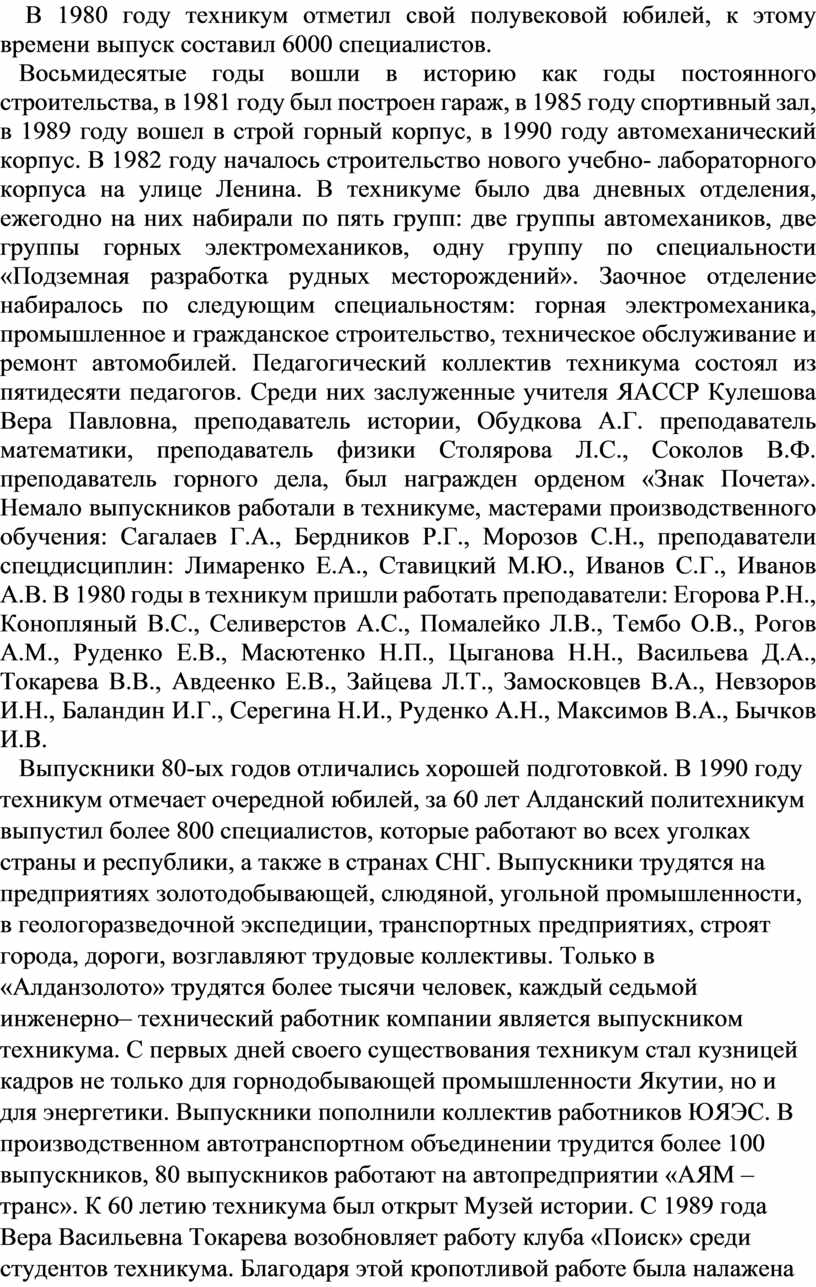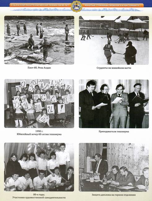 Выпускники 80-ых годов отличались хорошей подготовкой. В 1990 году техникум отмечает очередной юбилей, за 60 лет Алданский политехникум выпустил более 800 специалистов, которые работают во всех уголках страны и республики, а также в странах СНГ. Выпускники трудятся на предприятиях золотодобывающей, слюдяной, угольной промышленности, в геологоразведочной экспедиции, транспортных предприятиях, строят города, дороги, возглавляют трудовые коллективы. Только в «Алданзолото» трудятся более тысячи человек, каждый седьмой инженерно– технический работник компании является выпускником техникума. С первых дней своего существования техникум стал кузницей кадров не только для горнодобывающей промышленности Якутии, но и для энергетики. Выпускники пополнили коллектив работников ЮЯЭС. В производственном автотранспортном объединении трудится более 100 выпускников, 80 выпускников работают на автопредприятии «АЯМ – транс». К 60 летию техникума был открыт Музей истории. С 1989 года Вера Васильевна Токарева возобновляет работу клуба «Поиск» среди студентов техникума. Благодаря этой кропотливой работе была налажена связь со многими преподавателями и выпускниками техникума. 90- ые годы были нелегкими, как и для всей страны «годы перестройки», сократилось число специальностей, многие были закрыты. Но коллектив техникума старался сохранить свой высокий профессиональный уровень.