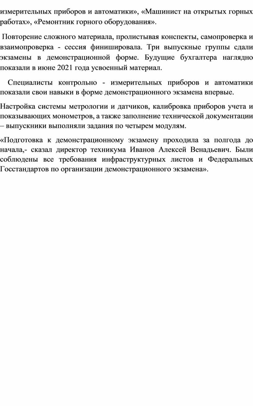«Подготовка к демонстрационному экзамену проходила за полгода до начала,- сказал директор техникума Иванов Алексей Венадьевич. Были соблюдены все требования инфраструктурных листов и Федеральных Госстандартов по организации демонстрационного экзамена».