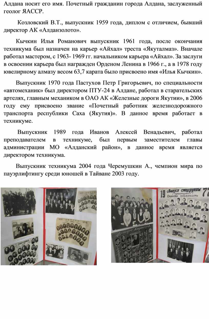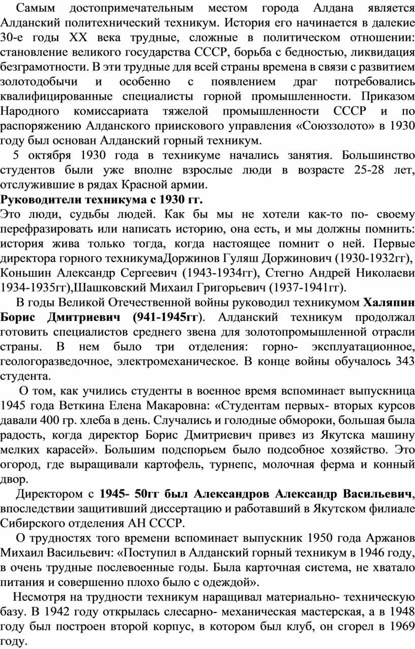 Техникум…Какое огромное значение имеет это слово для людей! Сюда подросток приходит за профессией. Здесь для него открывается мир профессий, он формируется как личность и конкурентно способный, высококвалифицированный специалист. Много средне- специальных учебных заведений у нас в стране, но у каждого есть своя, родная. Для небольшого города, как наш Алдан, огромное значение имеет наш техникум, это кузница кадров для горнодобывающей отрасли Республики (Саха)Якутия. Техникум является не только образовательным учреждением, но и культурным центром. У него очень богатая биография.