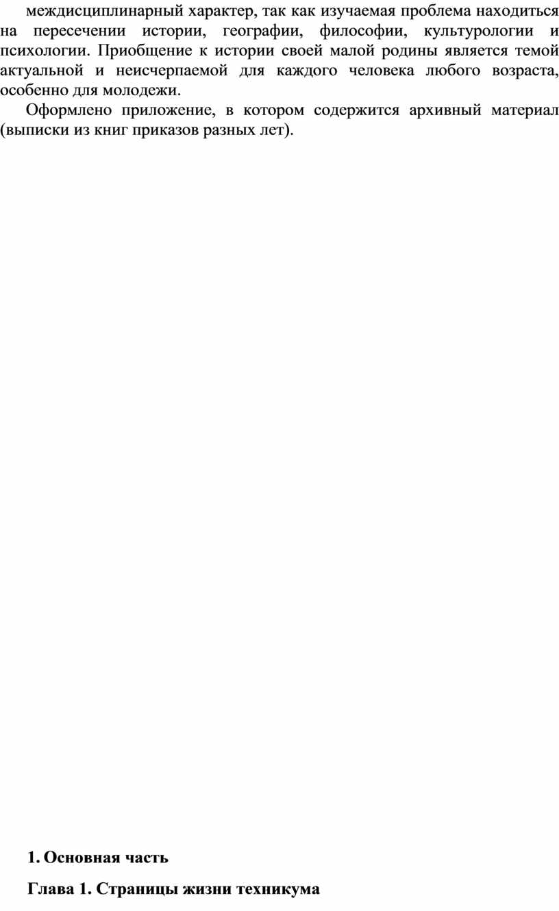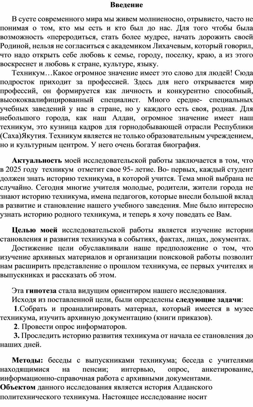 Объектом данного исследования является история Алданского политехнического техникума. Настоящее исследование носит междисциплинарный характер, так как изучаемая проблема находиться на пересечении истории, географии, философии, культурологии и психологии. Приобщение к истории своей малой родины является темой актуальной и неисчерпаемой для каждого человека любого возраста, особенно для молодежи.
