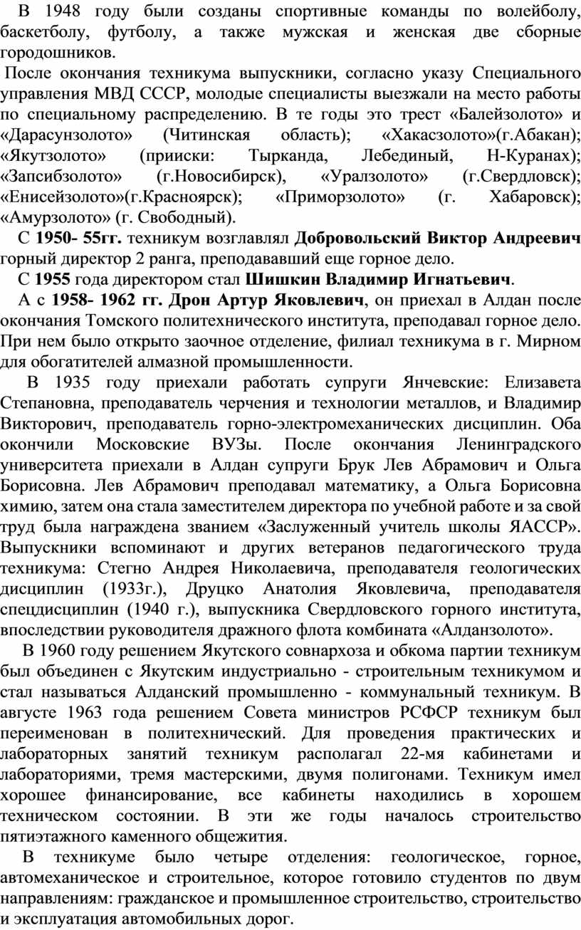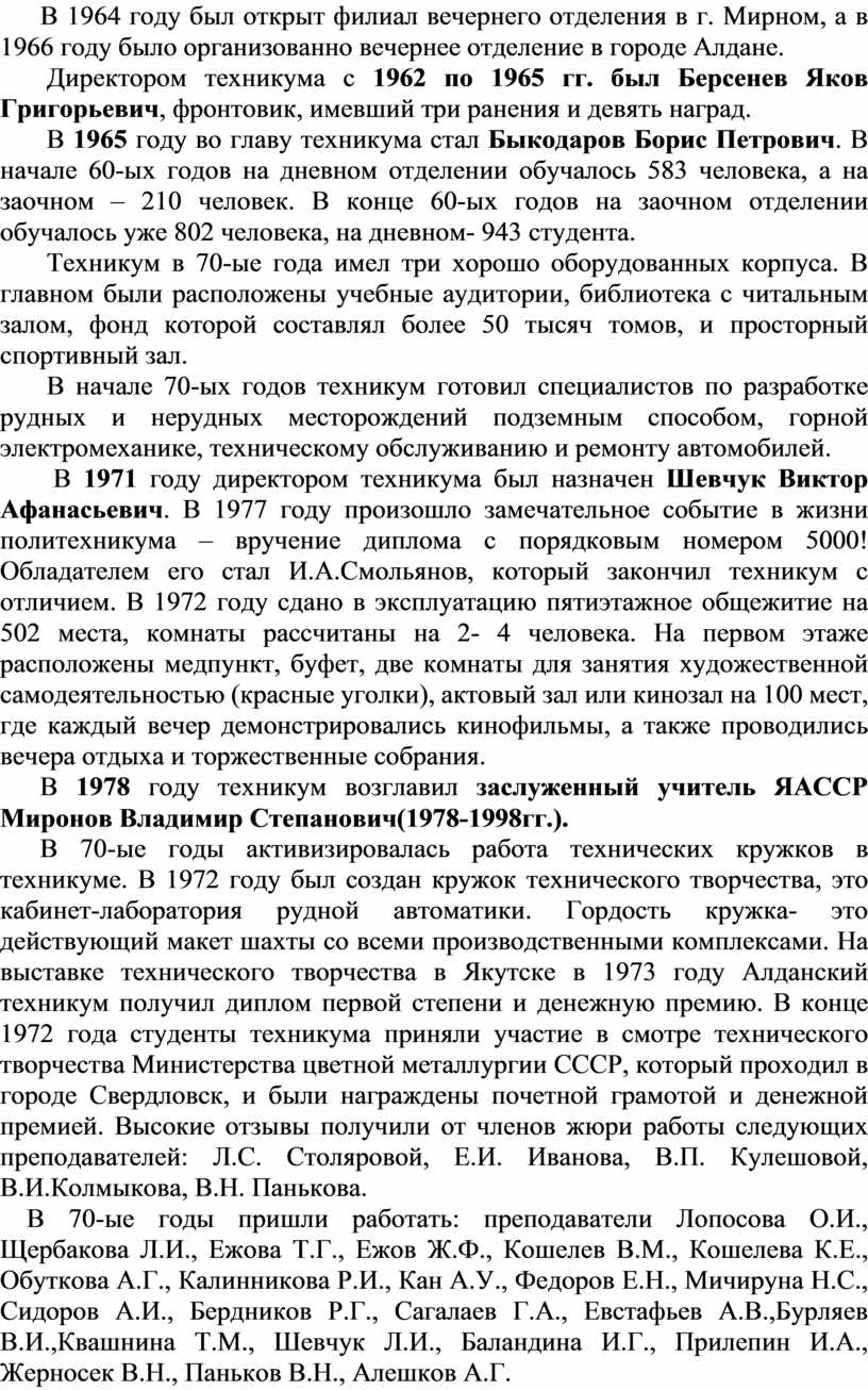 А с 1958- 1962 гг. Дрон Артур Яковлевич, он приехал в Алдан после окончания Томского политехнического института, преподавал горное дело. При нем было открыто заочное отделение, филиал техникума в г. Мирном для обогатителей алмазной промышленности.
