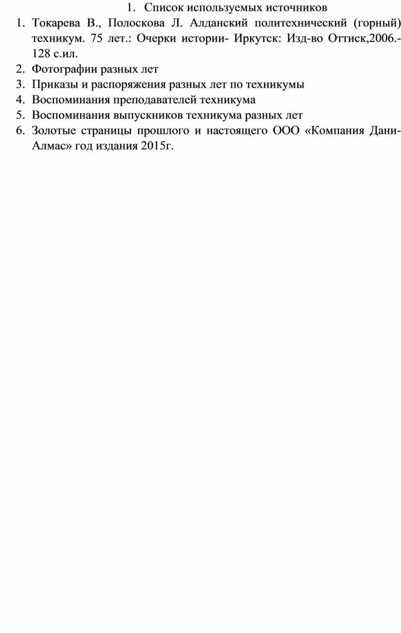 1. Токарева В., Полоскова Л. Алданский политехнический (горный) техникум. 75 лет.: Очерки истории- Иркутск: Изд-во Оттиск,2006.- 128 с.ил.