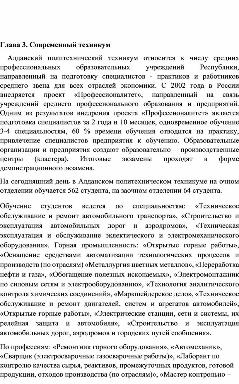 Алданский политехнический техникум относится к числу средних профессиональных образовательных учреждений Республики, направленный на подготовку специалистов - практиков и работников среднего звена для всех отраслей экономики. С 2002 года в России внедряется проект «Профессионалитет», направленный на связь учреждений среднего профессионального образования и предприятий. Одним из результатов внедрения проекта «Профессионалитет» является подготовка специалистов за 2 года и 10 месяцев, одновременное обучение 3-4 специальностям, 60 % времени обучения отводится на практику, привлечение специалистов предприятия к обучению. Образовательные организации и предприятия создают образовательно – производственные центры (кластера). Итоговые экзамены проходят в форме демонстрационного экзамена.
