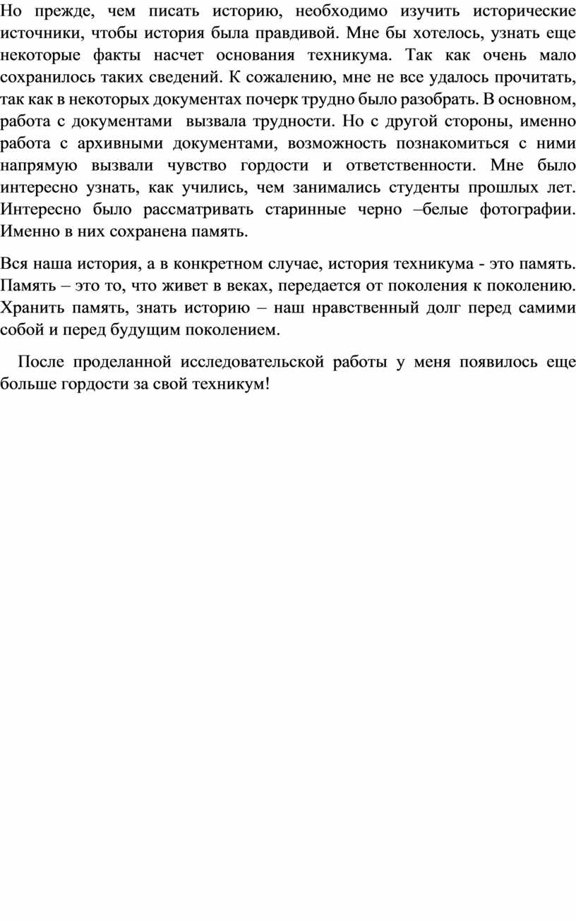 Но прежде, чем писать историю, необходимо изучить исторические источники, чтобы история была правдивой. Мне бы хотелось, узнать еще некоторые факты насчет основания техникума. Так как очень мало сохранилось таких сведений. К сожалению, мне не все удалось прочитать, так как в некоторых документах почерк трудно было разобрать. В основном, работа с документами вызвала трудности. Но с другой стороны, именно работа с архивными документами, возможность познакомиться с ними напрямую вызвали чувство гордости и ответственности. Мне было интересно узнать, как учились, чем занимались студенты прошлых лет. Интересно было рассматривать старинные черно –белые фотографии. Именно в них сохранена память.