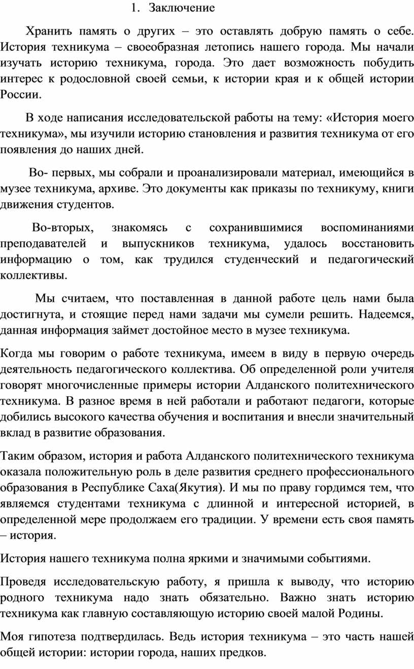 Проведя исследовательскую работу, я пришла к выводу, что историю родного техникума надо знать обязательно. Важно знать историю техникума как главную составляющую историю своей малой Родины.