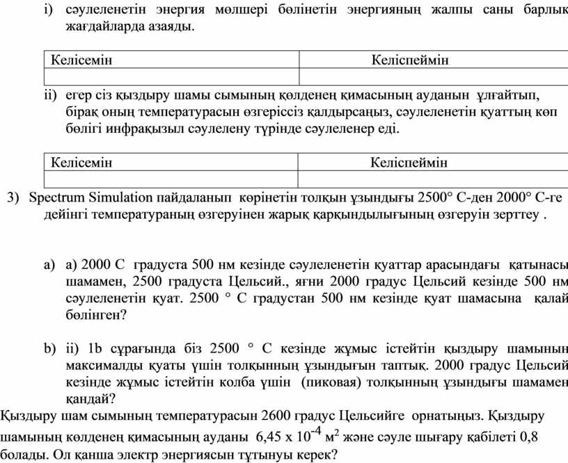 4) Қыздыру шам сымының температурасын 2600 градус Цельсийге орнатыңыз. Қыздыру шамының көлденең қимасының ауданы 6,45 x 10-4 м2 және сәуле шығару қабілеті 0,8 болады. Ол қанша электр энергиясын тұтынуы керек?