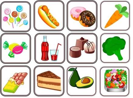 (Показывает картинки или называет предметы: яблоко, конфета, морковь, газировка, брокколи, хот-дог, корзина овощей, кусочек торта, авокадо, леденцы и т.д.). (Обсуждать каждый предмет, акцентируя внимание на пользе овощей и фруктов).