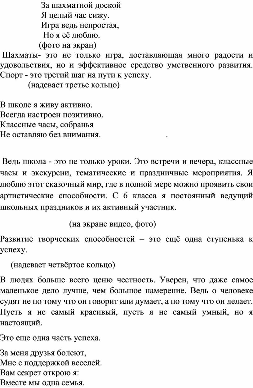 Вас, наверное, интересует вопрос. Зачем я в руках держу этот детский предмет? Всё просто. Эта пирамида ассоциируется в моём сознании с лестницей успеха, по которой в своей жизни взбирается каждый человек. Главное здесь - основание. Посмотрите,(вынимает нижнюю часть)не стало основания-и всё рассыпалось.