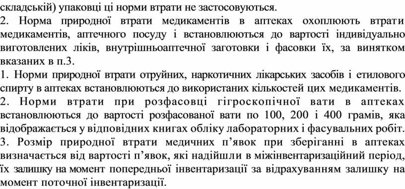 1. Норми природної втрати отруйних, наркотичних лікарських засобів і етилового спирту в аптеках встановлюються до використаних кількостей цих медикаментів.