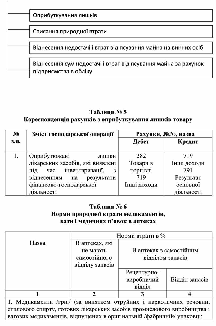 Недостача. У виробничих аптеках у разі недостачі розраховуються норми природної втрати (згідно з Інструкцією із застосування норм природної втрати медикаментів, вати і медичних п’явок в аптеках, затвердженою наказом МОЗ СРСР від 26.12.1986 р. № 1689). Встановлені норми природної втрати застосовуються тільки при недостачі товару (таблиця 6), виявленій під час інвентаризації.