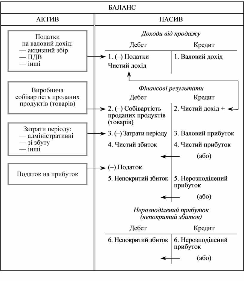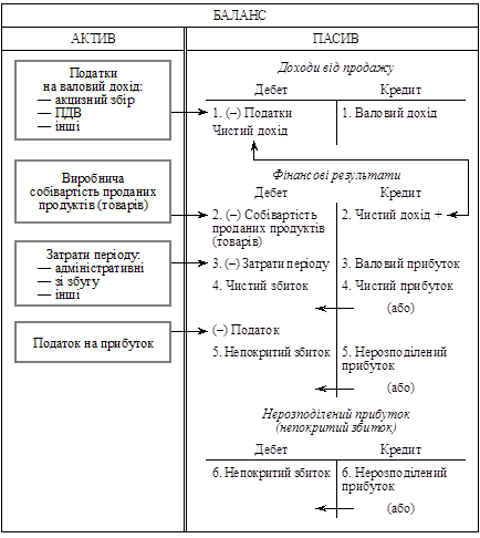 Кінцевий фінансовий результат в цілому по підприємству визначається як різниця між різними видами прибутків, що враховані на кредиті, і відповідно збитками і затратами, врахованими на дебет рахунка «Фінансові результати». Розглянемо послідовно вищенаведені процеси обліку.